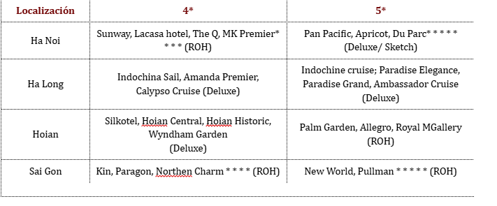 Los precios están expresados ​​en dólares estadounidenses por persona, en base a dos huéspedes compartiendo habitación doble o twin en los hoteles mencionados. Las tarifas a continuación no son válidas para Navidad, Año Nuevo (normalmente del 20 de diciembre al 10/15 de enero), Año Nuevo chino/vietnamita, Día de la Independencia (30 de abril), Primero de Mayo, Día Nacional (2 de septiembre), etc. Para más información sobre fechas específicas, contáctenos.