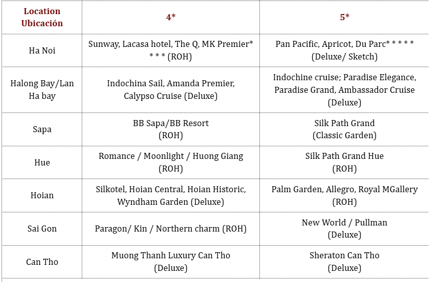 Los precios están expresados ​​en dólares estadounidenses por persona, en base a dos huéspedes compartiendo habitación doble o twin en los hoteles mencionados. Las tarifas a continuación no son válidas para Navidad, Año Nuevo (normalmente del 20 de diciembre al 10/15 de enero), Año Nuevo chino/vietnamita, Día de la Independencia (30 de abril), Primero de Mayo, Día Nacional (2 de septiembre), Año Nuevo Jemer (14-16 de abril), etc. Para más información sobre fechas específicas, contáctenos.